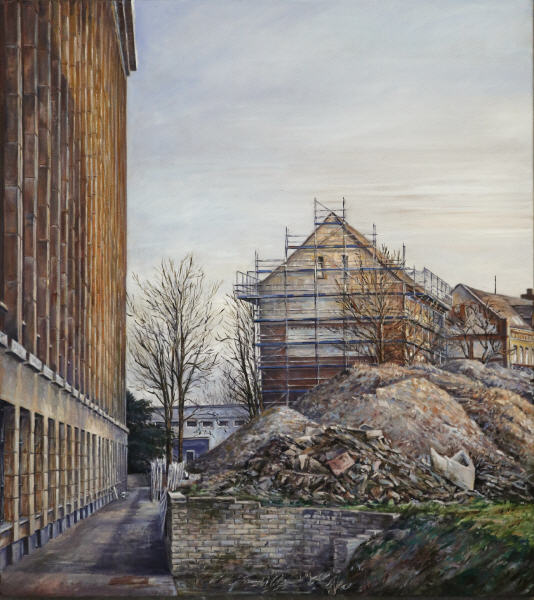 Wie die Natur die Landschaft verändert, so verändern der Mensch und die Zeit die Stadtlandschaften. Häuser werden gebaut, stehen, verwittern, verschwinden. Brachen entstehen, werden wiederentdeckt und bebaut. Die Giebel verschwinden. Mir rennt die Zeit davon. Ich kann gar nicht so schnell malen, um festzuhalten was mich fesselt.