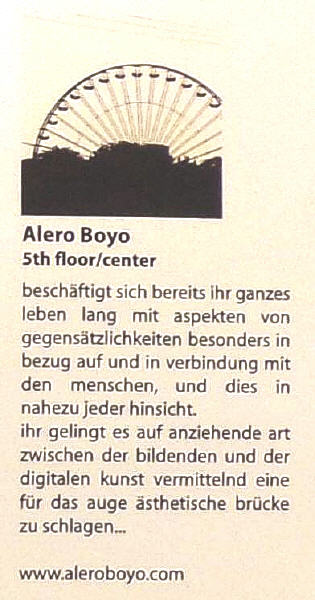 Klick oben auf den weiterführenden Bildlink hin zu einem VideoClip mit wenigen Atmos von Tag eins. Klick auf untenstehende Miniporträts bzw. Bilder zur Vergr&öuml;ßerung selbiger. Sollte es bei der Darstellung auf mobilen Endgeräten Anzeigeschwierigkeiten geben, klicke [hier ...]Alternative Darstellung der Künstlergalerie [hier ...]