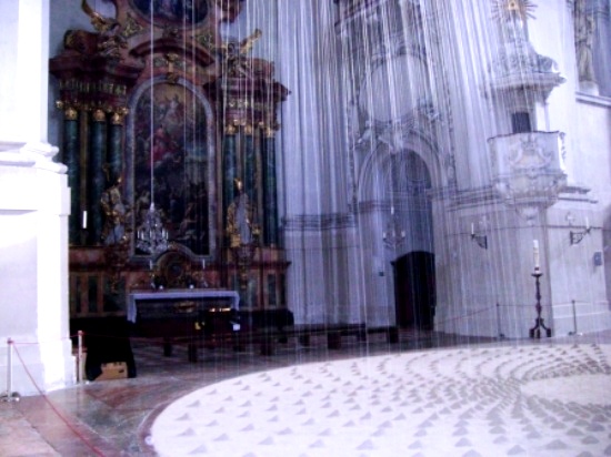Vom höchsten Punkt des Kirchenraumes, dem Dom, hat die Künstlerin etwa 70 km Seidengarn in 200 Arbeitsstunden zum Boden geführt, wo sie die Garne in einem runden Teppich in einem bestimmten Muster verknüpft hat, kleine Hügel ergebend.