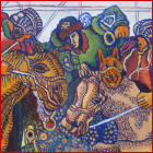 Ältere Herrschaften am Strand vor teigigen Wolkenformationen, mittelalterlich behelmte Kämpfer auf stilisiert deformierten Pferdchen, orientalische Tempel, europäische Pfandflaschenautomaten und rundliche chinesische Partei-Idole – die Sujets scheinen unerschöpflich.