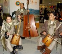 Kehlkopf-Sologesang, asiatische Perkussion, Schwanenhalslaute, Schlangenhaut-Geige |