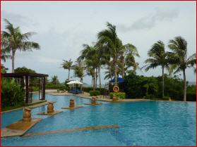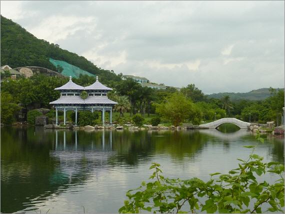 Von den beiden Städten Haikou und Sanja jeweils im äußersten Nordosten und Südwesten der Insel gelangt der Besucher in einer knappen Autostunde zu den schönsten Buchten und Stränden der Insel mit einer ganzen Reihe neu gebauter Hotels. Die meisten dieser Anlagen sind üppig mit tropischen Pflanzen ausgestattet und besitzen architektonisch schön gestaltete Pool-Bereiche, wie auch das Aegean Conifer Suites Resort Sanya, in dem ich untergebracht bin. Eine Besonderheit dieses Hotels in den Tropen ist auf dem Balkon zu finden. Hier ist in einer Ecke hinter einer Bambus-Jalousie eine breit geschwungene Badewanne eingebaut.
