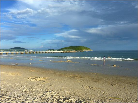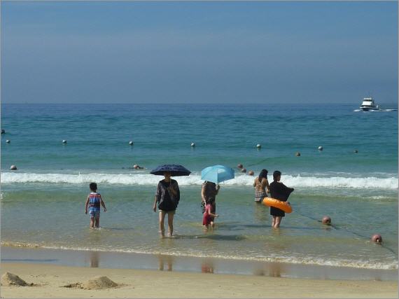 Ein merkwürdiger Anblick ist für mich die große Menge von chinesischen Erwachsenen im gelben Meer, die sich im mit kleinen Bojen abgrenzten Bereich für Nichtschwimmer drängen. Einige von ihnen tragen zusätzlich große bunte Schwimmringe. Dagegen ist der abgegrenzte Bereich für Schwimmer fast leer. Die Klärung dieses Phänomens ist simpel. Die allermeisten Chinesen können nicht schwimmen und ausländische Gäste sind derzeit noch rar.