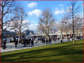 Auch vom Südufer der Themse kann man sich diesem Riesenrad ohne Jahrmarkt auf dem Queens Walk sanft annähern. Von der multifunktionalen königlichen Residenz Tower, dem Gefängnis, Waffenlager und Safe für die Kronjuwelen bis zur Modern Tate Galerie, dem riesigen Backsteinbau eines ehemaligen Kraftwerks, lässt es sich mit Touristen aus allen Ecken der Welt wunderbar bummeln. Die Südseite der Themse eröffnet den schönen Blick auf die Skyline von London mit der einzigartigen Mischung zwischen neuen und alten Gebäuden - und nicht zu vergessen dem Millennium-Wheel.