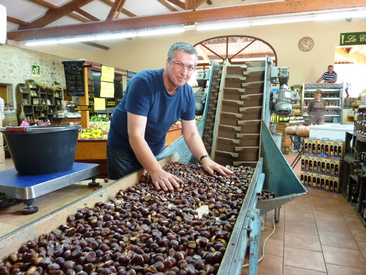 „Die Mengen der Esskastanie haben sich auf niedrigem Niveau behauptet und sind aus unserem Angebot überhaupt nicht wegzudenken.“ Die Edelkastanien gibt es bei ihm geschält in Gläsern, abgepackt als Kastanienmehl, als Creme, als Likör. „Am besten schmeckt der Likör aus Kastanien mit einem Schuss Weißwein aus der Region“, klärt er den Besucher auf, hat den Likör schon eingeschenkt und auch eine offene Flasche Chardonney in der Hand und füllt die Gläser. Der Aperitif Castagnou kann, so weiter Frèdèric, statt mit Wein noch mit einem Schuss Sekt weiter veredelt werden – „Sante!“