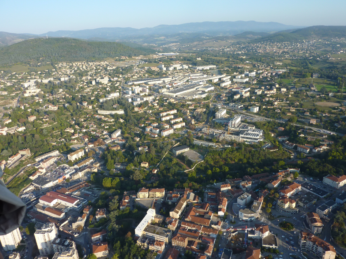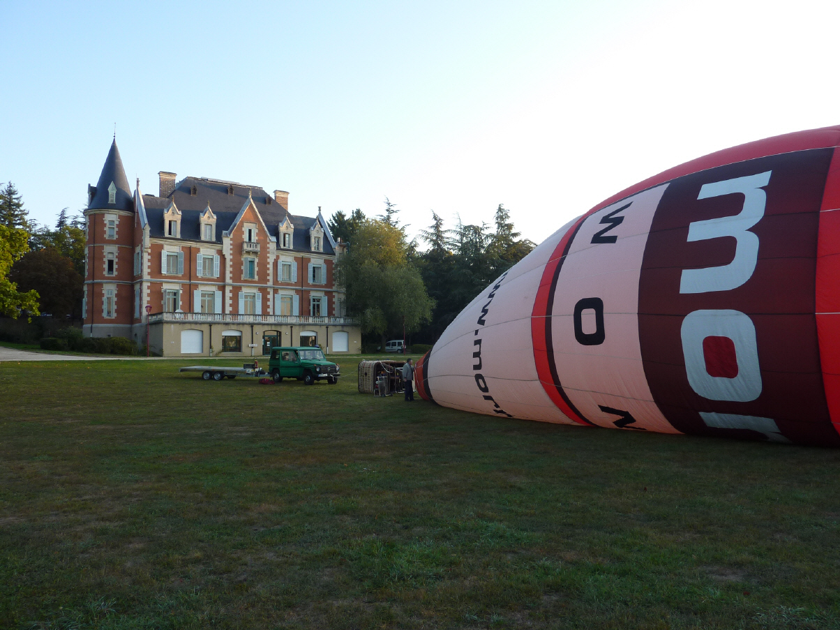 Der Abflugort ist ein Sportplatz am Schloss Dèomas in Annonay (links im Bild). In nur wenigen Minuten hat unser Ballonfahrer Ludovic Guicherd den Ballon mit Heißluft gefüllt und aufgerichtet. Als alle sechs Passagiere in die Gondel geklettert sind, erhebt sich der Ballon lautlos in die Höhe.
