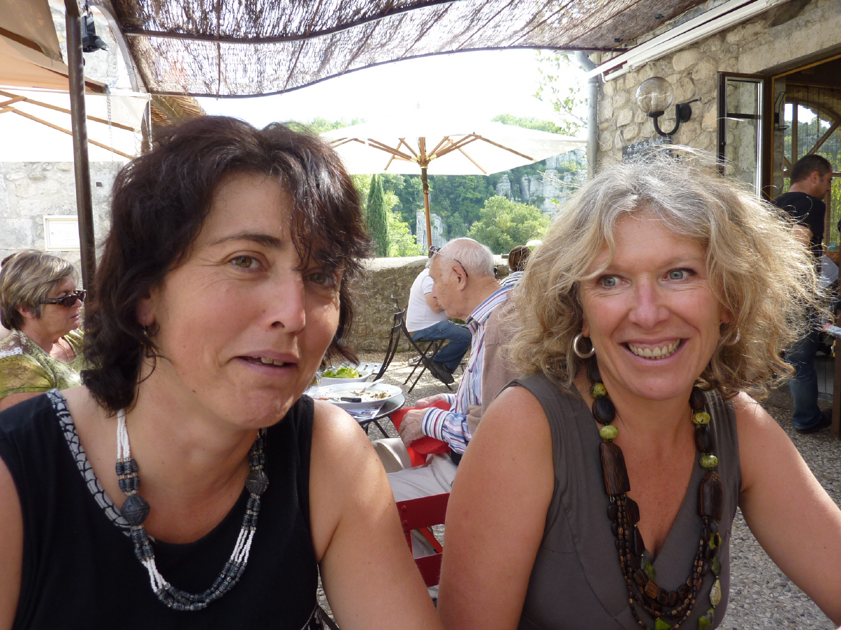 Das kleine romantische Dorf Labeaume liegt im Süden direkt an den steilen Felsufern des gleichnamigen Nebenflusses der Ardèche. Es hat seinen mittelalterlichen Charakter bewahrt. Auf der Terrasse des Bistrot des Pays mit dem Namen Le Bec Figue, ganz in der Nähe des Flusstales, treffe ich mit Cecile Mathieu zusammen (im Bild rechts zusammen mit Tourismusmanagerin Nathalie Sisteron). Sie gehört dem Verein zur Entwicklung des südlichen Ardèche an. Seine Mitglieder kämpfen gegen die Landflucht, wollen die Strukturen in ihrer ländlichen Region erhalten. Cecile kann von deutlichen Fortschritten berichten. Es kommen wieder mehr neue Ansiedler in die Andèche als Bewohner wegziehen.