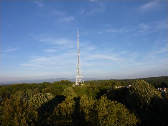 Der Turm wurde auf dem 333 Meter hohen Belvèdère im Jahr 1898 von einem deutschen Ingenieur in Stahlbauweise errichtet, der in seiner Ausführung dem Pariser Eifelturm ähnlich ist. Wir klettern die 20 Meter hoch zur Aussichtsplattform des Turms. Vor uns liegen die Vogesen sowie der Schwarzwald mit Blick Richtung Freiburg. Gut zu erkennen ist auch das französische Kernkraftwerk Fessenheim. Es liegt nur wenige Kilometer von der deutschen Grenze entfernt. Kürzlich versprach der neue französische Präsident Hollande, die 40 Jahre alte Atomanlage nach anhaltenden Protesten auf beiden Seiten der Grenze still zu legen.