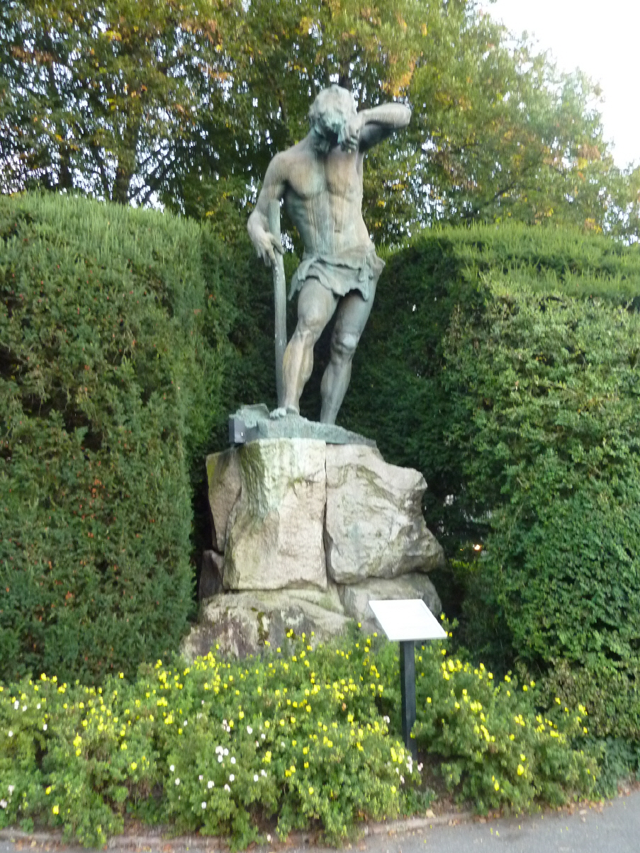 Die Statue eines wenig bekleideten jungen Mannes von dem Florentiner Künstler Beer aus dem Jahr 1905 stand zunächst am Schweizer Gotthard-Tunnel. Da der Künstler die Rückseite gänzlich unbekleidet ließ, führten moralische Proteste der Eidgenossen zunächst zum Umzug nach Mühlhausen auf den Rathausplatz, um schließlich die steinerne Figur in einen Park an den Anfang des Villenviertels Rebberge zu setzen, wo die Rückseite durch Gebüsch verdeckt wird. Dieser Standort in der Industrie- und Arbeiterstadt Mühlhausen/Mulhouse war insofern gut gewählt, so Lehrer Michel, weil der in Schweiß gebadete Mann der hier wohnenden Bourgeoisie jederzeit in Erinnerung ruft, wer ihren Reichtum angehäuft hat.