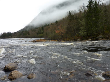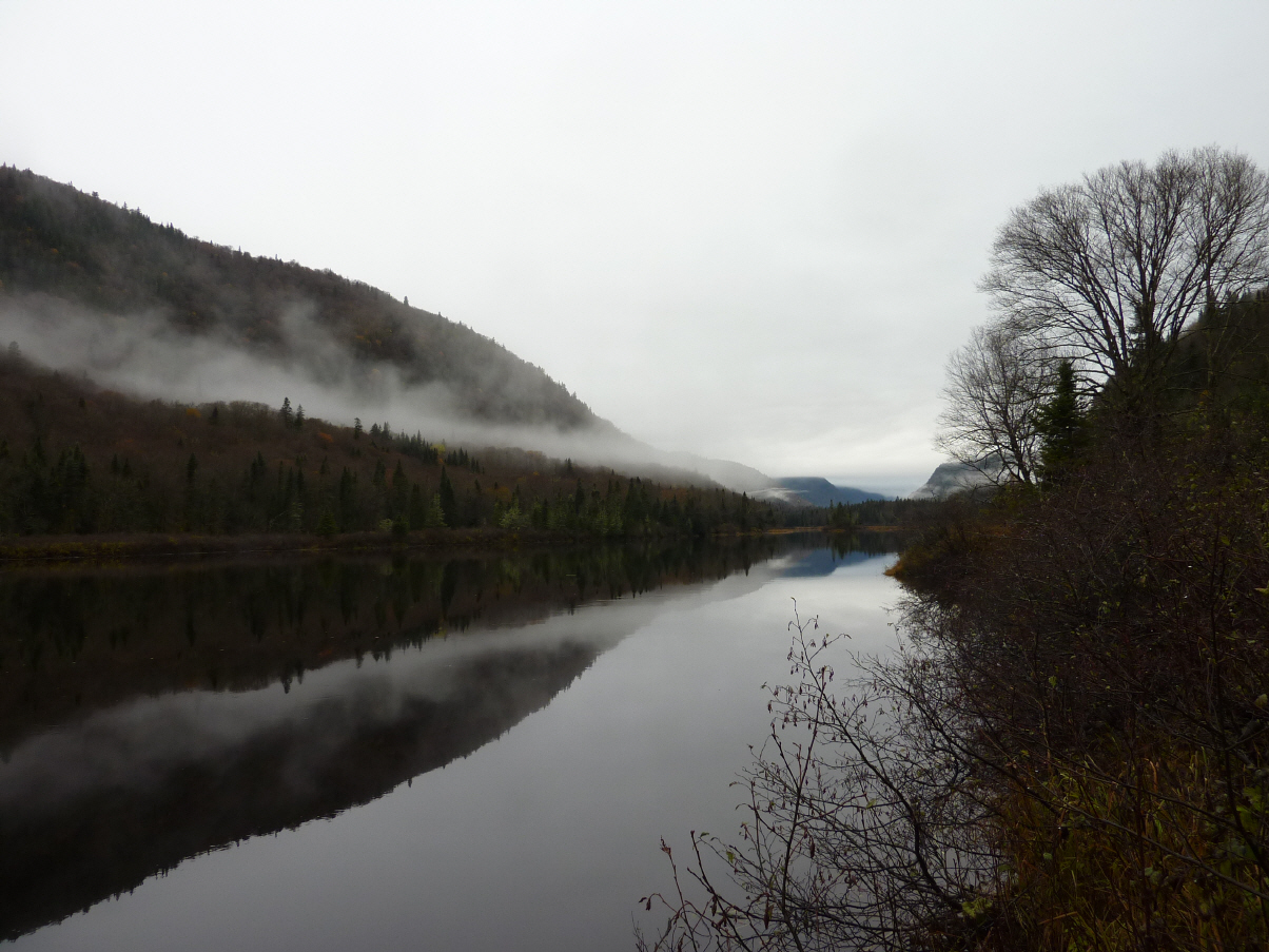 Nur 40 Kilometer von der Stadt Quèbec entfernt befindet sich der Park Jacques Cartier. Die Attraktion ist ein sehr hübsches 50 Kilometer langes Tal, durch das sich ein Fluss schlängelt. Das Tal zieht sich wie ein Fjord in die Landschaft, denn es hat an einigen Stellen bis zu 800 Meter hohe Felswände. Am gestrigen Tag und in der Nacht regnete es ununterbrochen. In der mehrstündigen Regenpause hängen die Wolken noch tief über dem Fluss und dem gesamten Tal - ein mystischer Anblick.