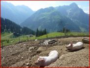 Hier lebt schon den dritten Sommer Mathias Büttner mit seiner Frau und seinen zwei Kindern. „Die Butter auf dem Käseteller“, so Büttner (i. B. links), „befand sich gestern noch im Euter der Kühe, die hier auf den Alpwiesen stehen.“ Am morgen und am frühen Abend müssen die Kühe von den Bergwiesen zur Melkanlage gebracht und gemolken werden. Ein langer Tag für den 38jährigen gelernten Koch, der sich auf die Käseherstellung spezialisiert hat und für die Besucher auch in der Küche steht.