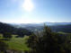 Die morgendliche Herbstsonne wärmt immer noch. Sie scheint auf die rustikalen Holztische der überdachten Holzterrasse. Der Blick geht den Hang hinunter in das 600 Meter tiefer liegende Tal. In der Ferne geben Wolkenfelder die Sicht frei auf den Gebirgszug der Karawanken.