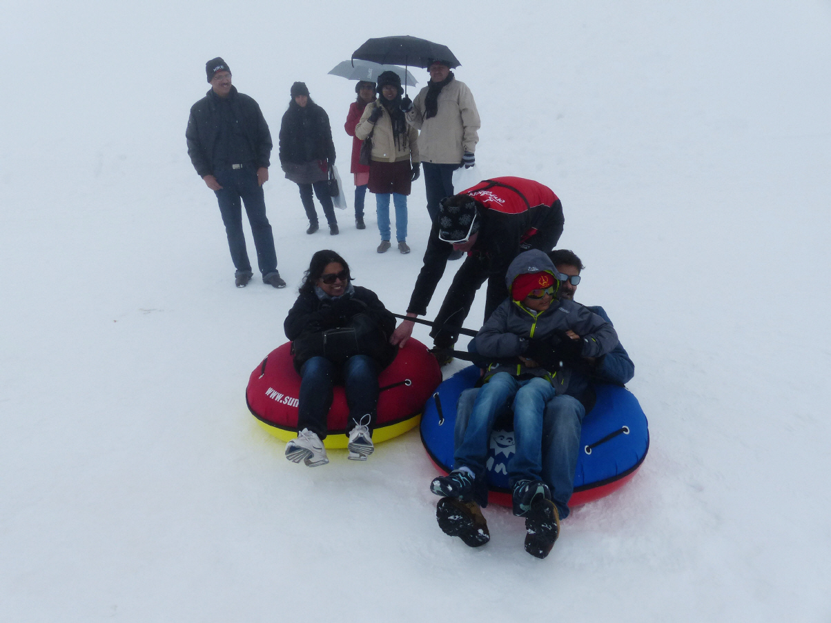 Der Gang über die Hängebrücke ist im Preis mit inbegriffen, die weitere Fahrt mit dem Sessellift Ice-Flyer kostenpflichtig. Die Sicht an diesem Tag im Mai wird durch einen Nebelvorhang verdeckt und Schneegriesel fällt ohne Unterlass vom Himmel. Doch die Touristen, darunter viele aus Asien (siehe auch Bild inks), lassen sich nicht davon abhalten, auf dem Gletscher in bunte Snow-tubes zu steigen. Rund 30 Sekunden dauert eine Rutschpartie. Benjamin Fallegger, ein junger Bursche vom Team der Bergbahnen, hilft beim Einsteigen. „Auch wenn die Sicht wie heute fehlt, wichtig ist für die Familien, dass sie hier sind und überall Schnee in die Hand nehmen können.“