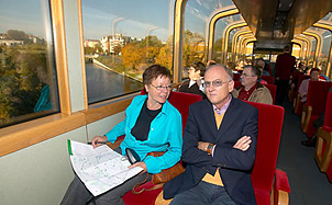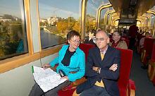 Diese S-Bahn mit der großen Sicht ist immer Samstag und Sonntag (Abfahrt und Ankunft Ostbahnhof) 66 Minuten lang auf dem Südring und der Stadtbahn unterwegs und hat einen profunden Stadtführer an Bord, der live informiert und erklärt. Die themenbezogenen Fahrten zeigen das neue sowie das historische Berlin und jetzt neu eingeführt jüdische Orte am Rande des S-Bahnringes. Werden die Ausführungen zu trocken, kann eine mit Bier, Sekt und Mineralwasser ausgerüstete Bar Abhilfe schaffen.
