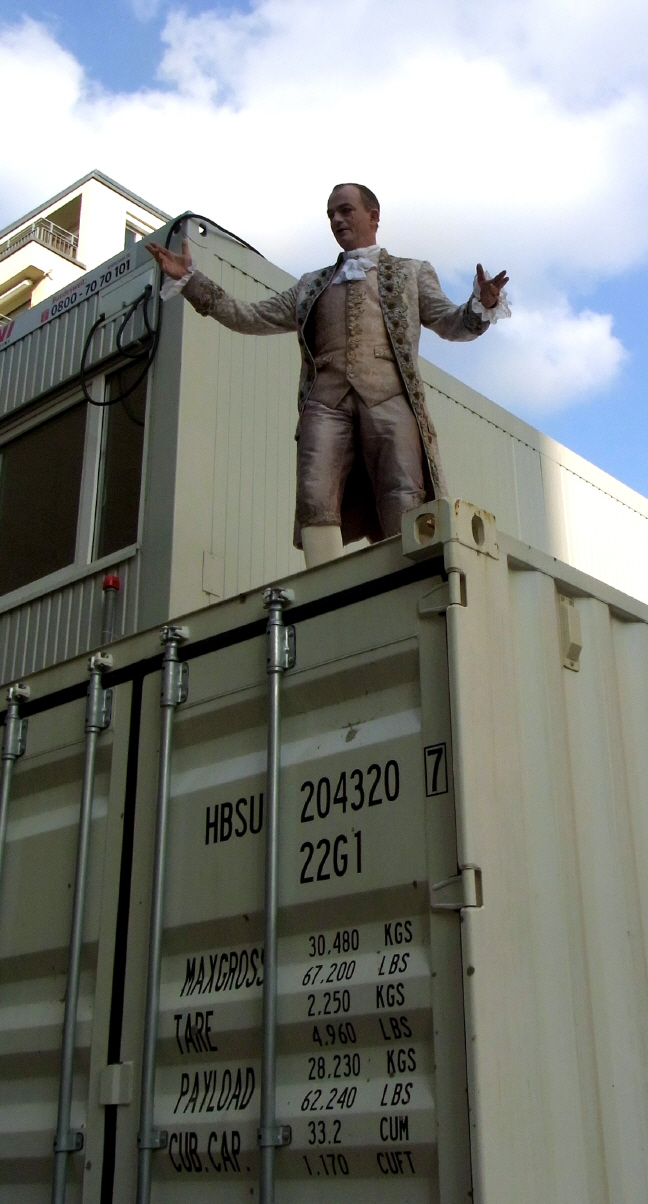Alexander Schröder und Peter Trabner - beide in barocken Kostümen mit manchmal recht absonderlichen Frisuren - führen die Gäste spielerisch durch die Geschichte des Schillertheaters, laden nach draußen ein und stellen auf dem Weg zurück zur Theaterwerkstadt das in der Nachbarschaft befindliche Oberstufenzentrum für Körperpflege vor - Schule der 48 Hauptdarsteller der Performance.