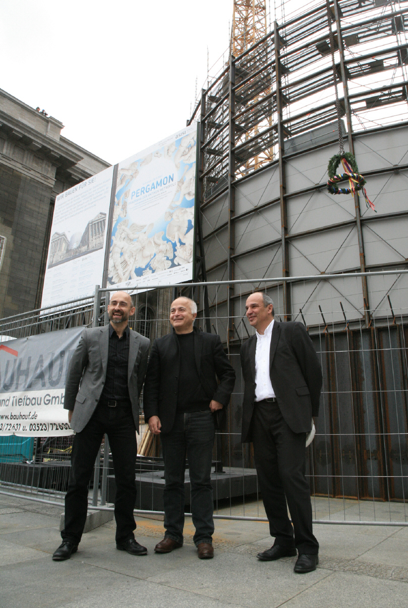 Links im Bild: Martin Maischberger, stellv. Direktor der Antikensammlung der Staatlichen Museen zu Berlin, Yadegar Asisi, Panoramakünstler und der ausführende Architekt Anuschah Behzadi, Behzadi + Partner Architekten BDA, Berlin beim Pressetermin zum Rotunden-Richtfest für PERGAMON-Panorama der antiken Metropole, © asisi