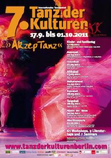 Unter dem Motto »AkzepTanz« findet das 7. Tanz der Kulturen Festival 2011 in Berlin statt. Das Tanzen schafft die Kommunikation über die Grenzen der Kulturen, der gemeinsamen Sprache, des Alters und des sozialen Hintergrunds hinweg. Besuchen Sie die Website des Vereins: [mehr ...]