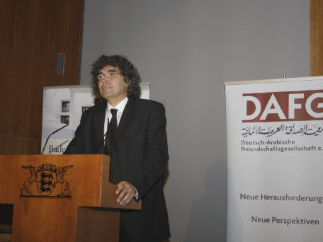 „Ihre auch auf einer ausgesprochen guten fachlichen deutsch-syrischen Kooperation basierenden Erfolge stehen zugleich für den Leitgedanken der Völkerverständigung, wie sie die hier in Berlin sehr erfolgreiche Deutsch-Arabische Freundschaftsgesellschaft in ihrer täglichen Arbeit lebt.“Die Begrüßung für die DAFG e.V. übernahm der Präsident der Gesellschaft Dr. Otto Wiesheu. Er hob hervor, dass Kultur „eine Brücke ist, die uns mit Arabien verbindet. Wir können hier nur staunen, was es vor 3.000 Jahren an Wissen, Kultur und Technik dort schon alles gegeben hat.“ Er dankte dem syrischen Botschafter und Syrien dafür, dass sie die kostbaren Ausstellungsstücke an Stuttgart ausgeliehen haben, um sie dort einer breiten Öffentlichkeit zugänglich zu machen.