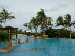 Von den beiden Städten Haikou und Sanja jeweils im äußersten Nordosten und Südwesten der Insel gelangt der Besucher in einer knappen Autostunde zu den schönsten Buchten und Stränden der Insel mit einer ganzen Reihe neu gebauter Hotels. Die meisten dieser Anlagen sind üppig mit tropischen Pflanzen ausgestattet und besitzen architektonisch schön gestaltete Pool-Bereiche, wie auch das Aegean Conifer Suites Resort Sanya, in dem ich untergebracht bin. Eine Besonderheit dieses Hotels in den Tropen ist auf dem Balkon zu finden. Hier ist in einer Ecke hinter einer Bambus-Jalousie eine breit geschwungene Badewanne eingebaut.