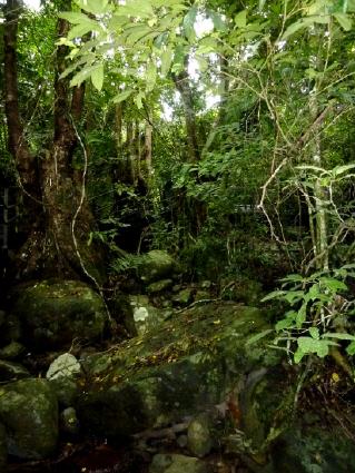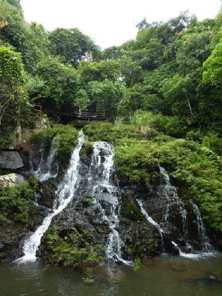 Auf dem Weg nach oben passieren die Besucher eine Vielzahl von tropischen Bäumen und Gewächsen. Dazu gehören wuchtige Bananenbäume ohne Früchte, der Bambole-Baum mit besonderer Rinde, eine See-Kartoffel, überall schlanke Stämme von über 20 Meter hohen Gummibäumen und nicht zu vergessen alle paar Meter ein riesiger Ficus, der auch bei vielen in Deutschland im Wohnzimmer steht. Ich fotografiere Farne, die bereits seit 150 Millionen Jahren auf der Erde wachsen und eine Zuckerpalme mit Kinderfaust großen schwarzen Früchten, aus denen Zucker gewonnen wird, der sehr gesund sein soll. Um zu den Wasserfällen zu gelangen, muss ich viele Treppenstufen steigen und schwitzen. Mein Hemd ist so nass als ob ich es gerade aus der vollen Badewanne gezogen habe.