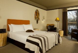Alle Räume sind geprägt von durchgängig verbautem Holz und unzähligen Wolfs- und Biberpelzen, die die Sessel schmücken sowie Elch-Geweihen an den Wänden. In den Hotel-Suiten liegt mitten im Wohnraum sogar das Fell eines Schwarzbären.