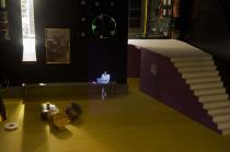 Die projizierte Miniaturfigur tritt mit dem Publikum in Kontakt, stellt Fragen, kommentiert Reaktionen, tauscht sich über die Ausstellungsinhalte aus und fachsimpelt über Gerüchte.