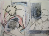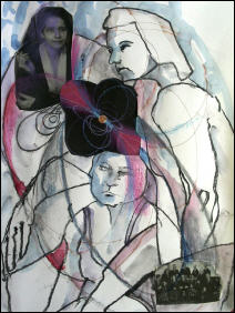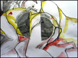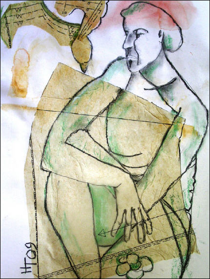 "Ich bereite vor der Sitzung meine Blätter vor: als Monoprint mit Wasserfarben, Tinten oder Akryl, und zeichne während der Sitzung mit Tinte, Holzkohle oder 'mixed media' hinein. Natürlich bin ich bei meiner Vorbereitung beeinflusst von Dingen, Strömungen, Tagesgeschehen, und ich finde, dass meine skizzenhafte Darstellung der Probleme legitim ist. Mit anderen Worten, ich hole die Tagespolitik ins Wohnzimmer und stelle die Übersättigung dar."