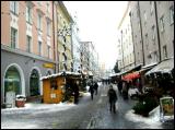 Die Standleute sind in dicke Pelzmäntel gehüllt, aber sie haben zu ihren Füßen Gas- oder Petroleumheizer, sagen sie. Zwischen den Ständen steht ein ohrengeschützter Geiger aus Italien und fidelt seine Lieblingslieder von Sonne und Liebe. Ein anderer Schausteller steht mitten auf dem Platz umgeben von Schneewirbeln, ganz in Silber, so dass seine Augen ganz fremd wirken und er lädt uns mit einer lächelnden Geste ein, etwas zu spenden. An einem kleinen Tisch verkaufen zwei junge Mädels ihr selbst gebackenes Gebäck und da kaufe ich gleich ein Kilo davon, und sie würden jetzt bald zusammenpacken und morgen wieder kommen mit neuen Sortiments, antworten sie auf meine Frage, wie sie denn die Kälte ertragen. Die Vanillekipferl schmecken wirklich ausgezeichnet. |