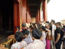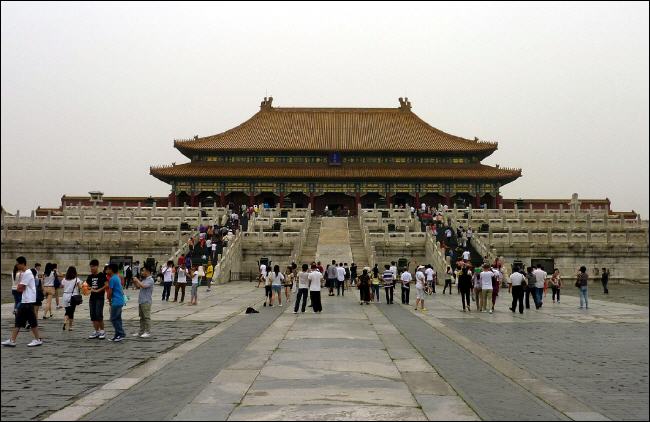 Die verbotene Stadt, Anfang des 15 Jahrhunderts vollendet, beherbergte 24 Kaiser mit ihrem Hofstaat sowie Beamte und Würdenträger. Mittlerweile wird sie täglich mit Heerscharen von Touristen überschwemmt. Dennoch kann dieser in einer Linie aufgebaute Komplex mit dem elegant geschwungenen Dach der Halle der Höchsten Harmonie, mit seinen verzierten Torbögen und den chinesischen Löwen, die alles bewachen, seine Pracht bis heute bewahren.