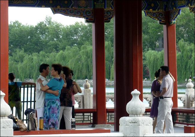 Eine malerisch gelegene Weiße Pagode auf der Jade-Insel inmitten eines kleinen Sees, dominiert den Park. Chinesische Familien mit Kindern und Liebespaare wandern um den See. Besonders die fünf Pavillons am See haben es mir angetan. Hier erklingt Musik, Paare drehen sich beim Tanz, junge und ältere Spaziergänger haben auf Stühlen in den Pavillons Platz genommen, hören der Musik zu und schauen auf das glitzernde Wasser des Sees. Alles strahlt eine entspannte Atmosphäre aus. Ein starker Kontrast zu den Pracht-Boulevards der Innenstadt und den Verkehrsströmen der sechsspurigen Stadtautobahnen.