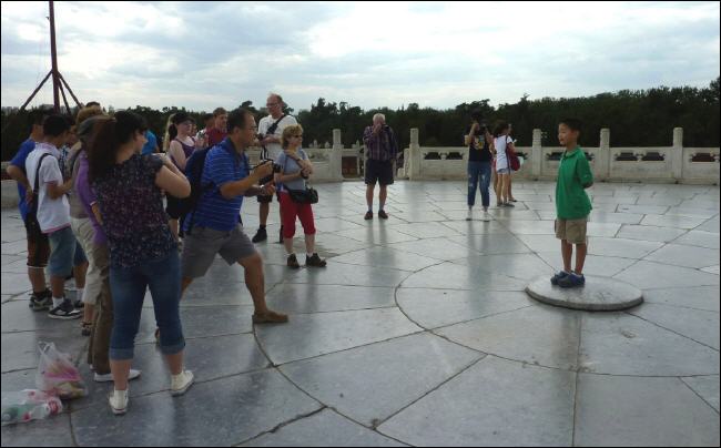 Eine runde Steinplatte im Zentrum des Altars gilt seit alters her für die meist chinesischen Besucher als Zentrum der Welt. Jeder chinesische Besucher will auf diesem Platz fotografiert werden und geduldig wird in der Warteschlange Fotomotiv gewartet.