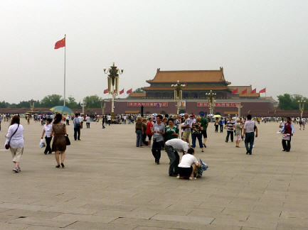 Auf dem Platz des Himmlischen Friedens existiert keinerlei Erinnerung an einen anderen Zivilisations-Schaden, die blutigen Ereignisse im Juni 1989. Es sei denn, man rechnet dazu, dass an einigen Ecken des riesigen Platzes wie auf einem Flughafen Taschen und Rucksäcke durchleuchtet werden. Ein paar Polizisten in Uniform und ihr Polizeiauto verlieren sich in tausenden von Touristen auf dem gigantischen Beton-Platz. Die Besucher haben scheinbar alle nur eines im Sinn: Fotografieren. Und einige wenige ohne Fotoapparat werden von auf dem Platz stationierten professionellen Fotografen zu Fotos für Daheim animiert. Der größte Platz der Welt ist zu einem von klickenden Fotoapparaten und Handys besetzten Fotomotiv geworden.