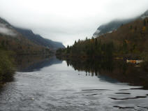 Nur 40 Kilometer von der Stadt Quèbec entfernt befindet sich der Park Jacques Cartier. Die Attraktion ist ein sehr hübsches 50 Kilometer langes Tal, durch das sich ein Fluss schlängelt. Das Tal zieht sich wie ein Fjord in die Landschaft, denn es hat an einigen Stellen bis zu 800 Meter hohe Felswände. Am gestrigen Tag und in der Nacht regnete es ununterbrochen. In der mehrstündigen Regenpause hängen die Wolken noch tief über dem Fluss und dem gesamten Tal - ein mystischer Anblick.
