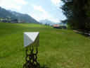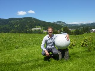 Wir sitzen in dem kleinen Wintergarten des Hotels und schauen auf eine große grüne Fläche, den Natur-Lebenspark. Der 45.000 Quadratmeter große Park wurde Anfang Juni dieses Jahres eröffnet und soll als eine „Tankstelle für Energie“ wirken. Auf einer Lauf-Strecke von nur 1200 Metern erreicht der Besucher insgesamt sieben Stationen, wo er auf unterschiedlich gestalteten Sitzmöglichkeiten mit schöner Aussicht auf die Berglandschaft einen Ruhepunkt findet. Auf den Stationen ist nacheinander einer von fünf platonischen Steinen aufgestellt. Die Steine, nach dem Griechen Platon benannt, sind aus massivem weißen Granit gefertigt, ebenso eine Kugel und auf der letzten Station die Mer-Ka-Ba.