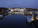 Mehr als 200 dieser im skandinavischen Stil gebauten Ferienhäuser im Hafendorf haben ihre privaten Eigentümer gefunden. Das Hotel hat sich allerdings 20 Häuser reserviert, die der Gast als Insel-Suite, egal ob er mit Auto oder Boot anreist, mieten kann. Insgesamt 60 Liegeplätze laden zu einem Kurzbesuch im Hafendorf ein.