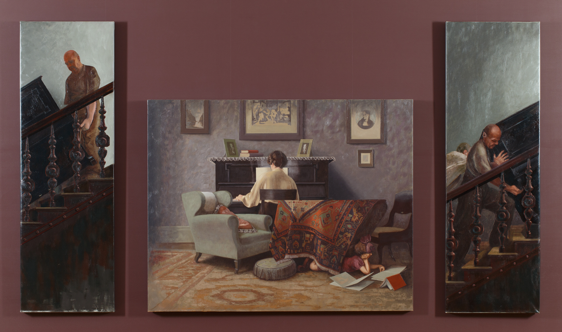 Die in Brighton lebende Malerin Barbara Loftus zeigt im Ephraim-Palais einen Werkkomplex von außergewöhnlicher Prägnanz. Gerade einmal 16 Gemälde genügen, um die – scheinbar – behagliche Welt ihrer jüdischen Großeltern in Berlin-Schöneberg heraufzubeschwören. Sie kombiniert klassische figurative Ateliermalerei mit Inszenierung, historischer Recherche und digitalen Medien.