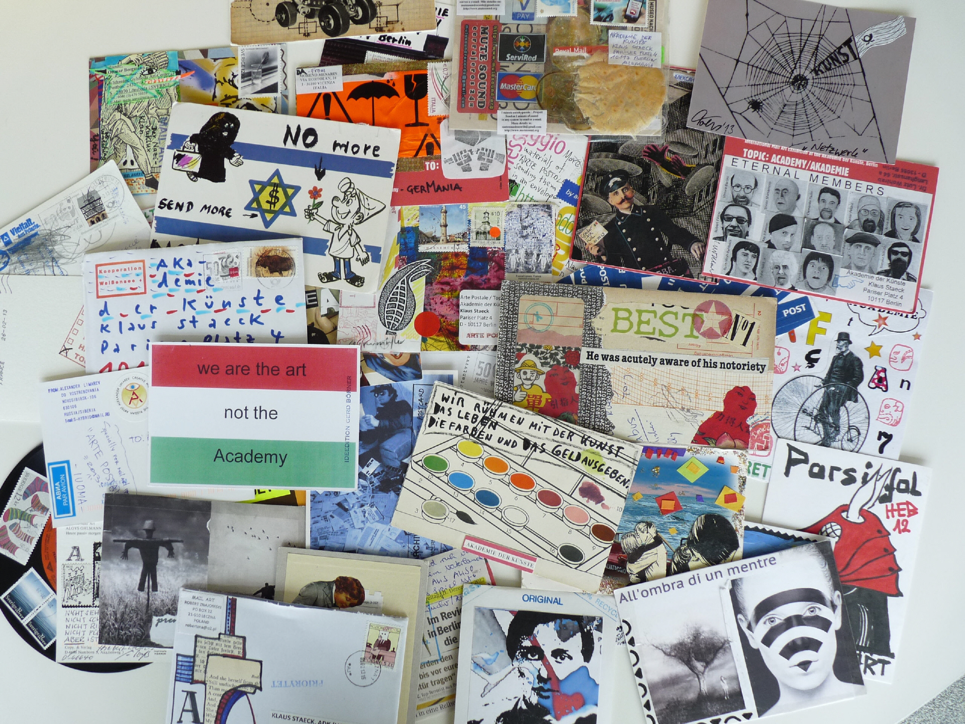 Abildung oben: Einsendungen zur internationalen Mail Art-Aktion „Academy/Akademie“ von Klaus Staeck und Lutz Wohlrab anlässl ich der Akademie-Ausstellung ARTE POSTALE, 2013, Foto: Lutz Wohlrab