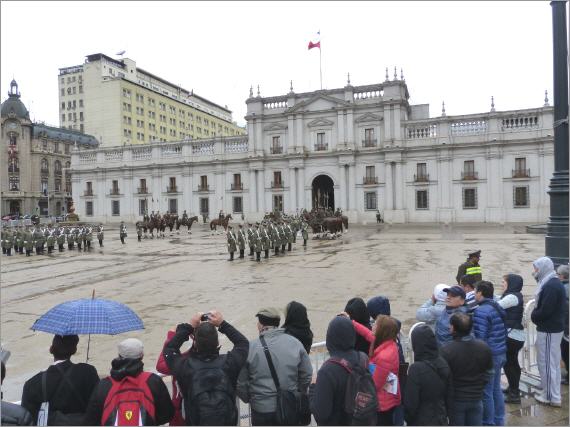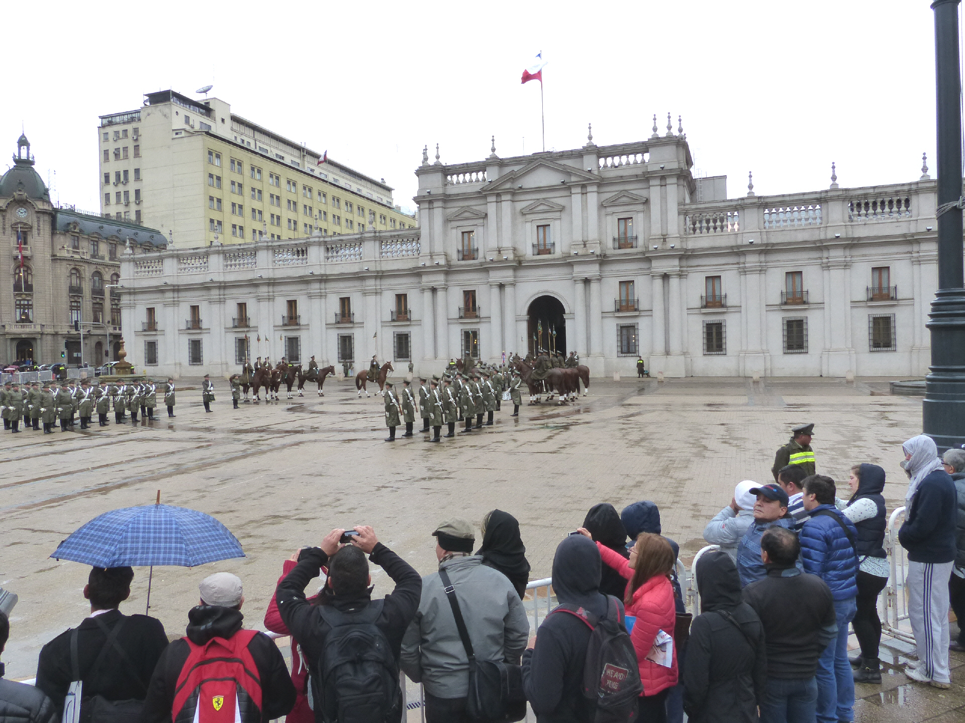Vor 42 Jahren gingen die dramatischen Bilder der Bombardierung und die letzten Worte von Präsident Allende in einer Radioübertragung um die Welt. Gegenwärtig findetvor diesem Palacio alle zwei Tage immer Vormittags eine pompöse militärische Wachablösung mit Soldaten zu Pferde statt. Trotz Nieselregen haben sich zahlreiche Touristen und ein paar Passanten eingefunden. Hier wird nun die chilenische Variante eines militärischer Aufzuges vorgeführt, die einiges über das Land erzählt.