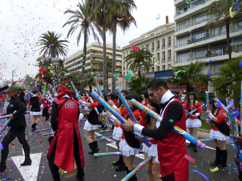 Ständig sind einige Dutzend schwarz gekleidete und im Gesicht bunt geschminkte junge Leute rund um den Umzug unterwegs. Auf ihren T-Shirts steht in großen Buchstaben BAT, die Brigade für Animation. Sie sorgen für ein Gewitter an Konfetti und bunten Luftschlangen. Zum absoluten Höhepunkt der Blumenschlacht werden alle Blumenwagen entkleidet. Es prasselt Blumen über Blumen, insgesamt wohl fünf Tonnen, in das erwartungsvolle Publikum hinein. Und jeder bindet sich seinen Blumenstrauß.