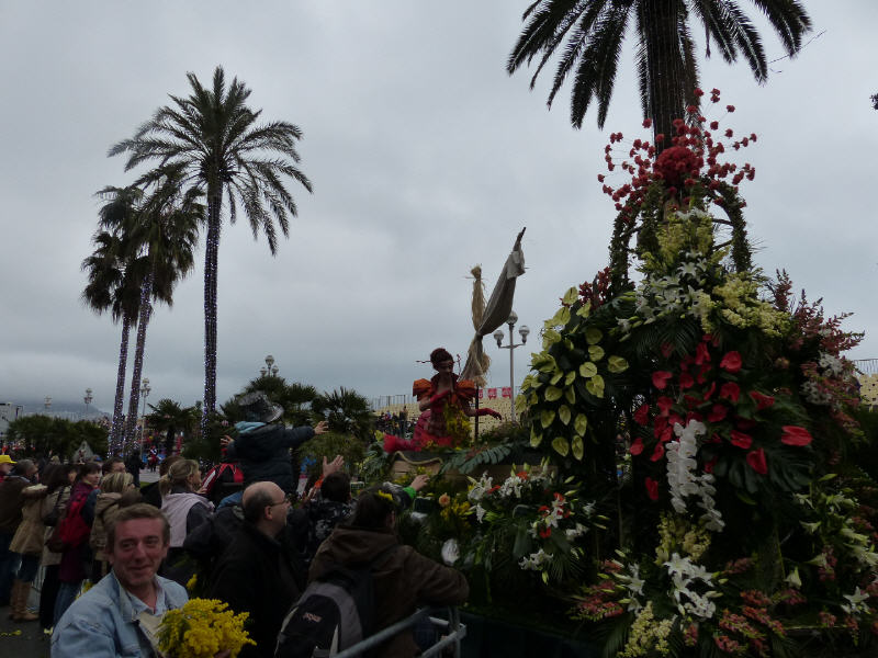 In der Halle hängt schwerer, leicht betäubender Blütenduft. Gladiolen, Chrysanthemen, Orchideen, Sonnenblumen, Mimosen, Gerberas, Margeriten, Rosen, Nelken, etwa 3000 Blüten und 30 Blumensorten schmücken die Wagen. Sie ziehen traditionell am Nachmittag in die berühmte Blumenschlacht (Bataille de Fleurs).