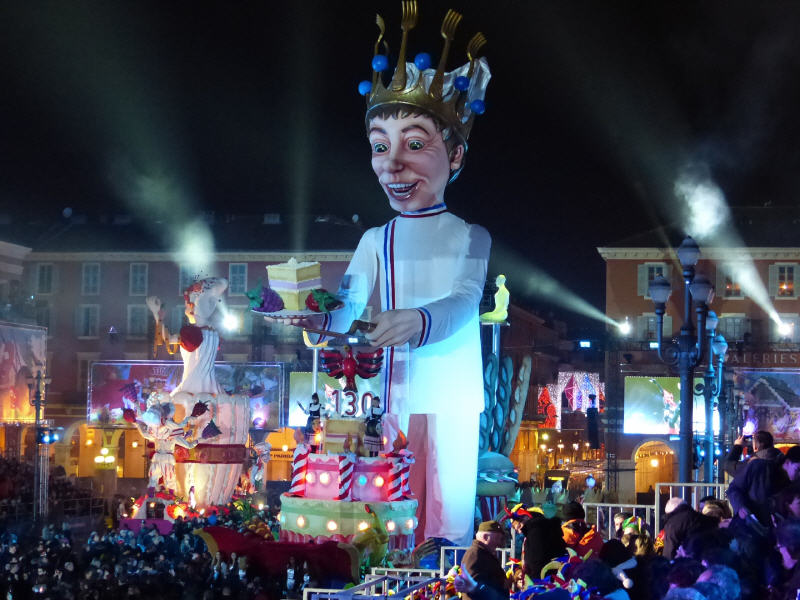 Mittendrin defilieren unter lauter Musik und teilweise ohrenbetäubenden Lärm wieder Tanzgruppen und Musiker sowie 18 thematisch gestaltete Wagen vorbei. Sie sind in diesem Jahr dem Thema Gastronomie gewidmet, suchen aber ähnlich dem Karneval im Rheinland kritische Sichten auf gesellschaftliche Themen. Da macht man sich aber nicht nur über die Vergabe von Michelin-Sternen lustig oder karikiert die Ernährung mit Fast Food, sondern setzt sich auch mit großer Politik auseinander. So sitzt die Pappfigur vom französischen Staatspräsident Hollande als Ausdruck seiner Politik auf einem Haufen von Käsestücken.