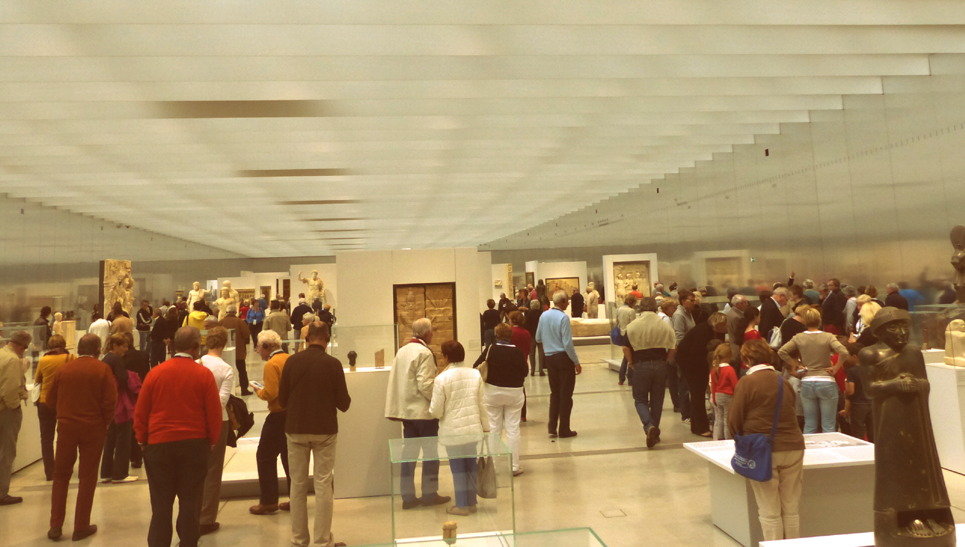 Die Zeitleiste ist ein Orientierungspunkt. So ist die Skulptur neben dem Mosaik und neben dem Gemälde platziert. Auch sind hier alle Zivilisationen vertreten, beginnend 3500 v. Christus mit einer Tontafel aus Mesopotamien im heutigen Irak bis hin zur Neuzeit im Jahr 1848. Neu an der Konzeption ist weiterhin, dass in diesem Kunstmuseum Sichtachsen zwischen den einzelnen Zivilisationen und Epochen entstehen.