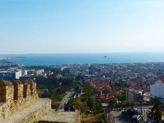 Es lohnt der Weg in die obere Altstadt, ein Stück entlang der Stadtmauer, um eine Aussichts-Plattform zu erreichen. Hier reicht der Blick weit über das Häusermeer und in die lang gestreckte schöne Bucht, an die sich die früher bedeutende Hafen- und Handelsstadt Thessaloniki anschmiegt.