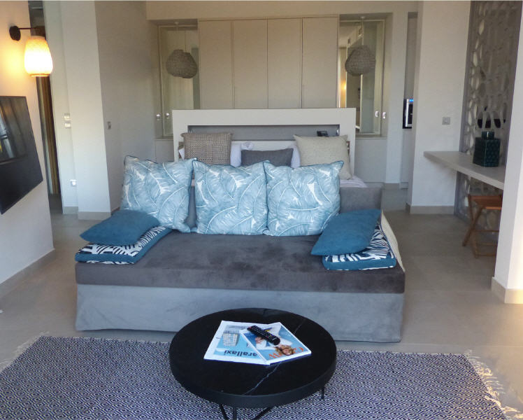 Die Größe der anderen Villen-Kategorien liegen bei 90 bzw. 60 Quadratmetern. Das entscheidende Merkmal: alle Villen verfügen über einen eigenen kleinen beheizten Pool, natürlich mit Blick auf das Meer sowie auch einen jeweils dazu gehörigen Garten.