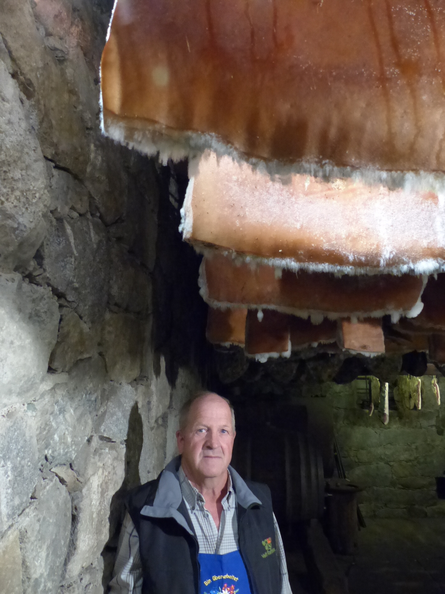 Der Bauer Sepp macht mit mir wie auch mit allen interessierten Urlaubern eine kleine Hofführung. Sie beginnt im geräumigen Kellergeschoss. In einem der Räume hängen die Bauchdecken und der Schlegel (Schinken) von Schweinen sowie Würste. In dem Kellerraum herrscht eine Luftfeuchtigkeit von etwa 80 Prozent, die für das Reifen notwendig ist.