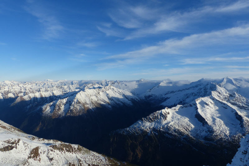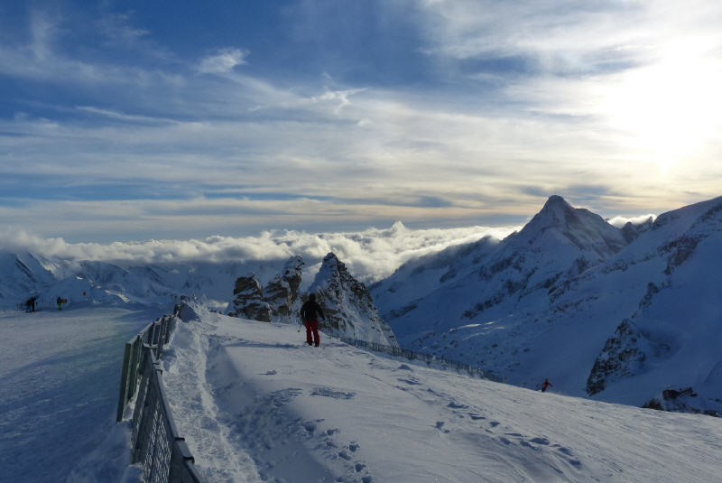 Die höchste Stelle des vier Kilometer langen Gletschers liegt auf 3250 Meter und an seiner tiefsten Stelle ist das Eis bis zu 120 Meter dick. Drei Seilbahnen sind unterwegs, um besonders bei sonnigem Wetter die Massen der Besucher nach oben zu befördern. Faszinierend ist ja nicht nur die Abfahrt, sondern auch die Rundumsicht auf die verschneiten Alpen.