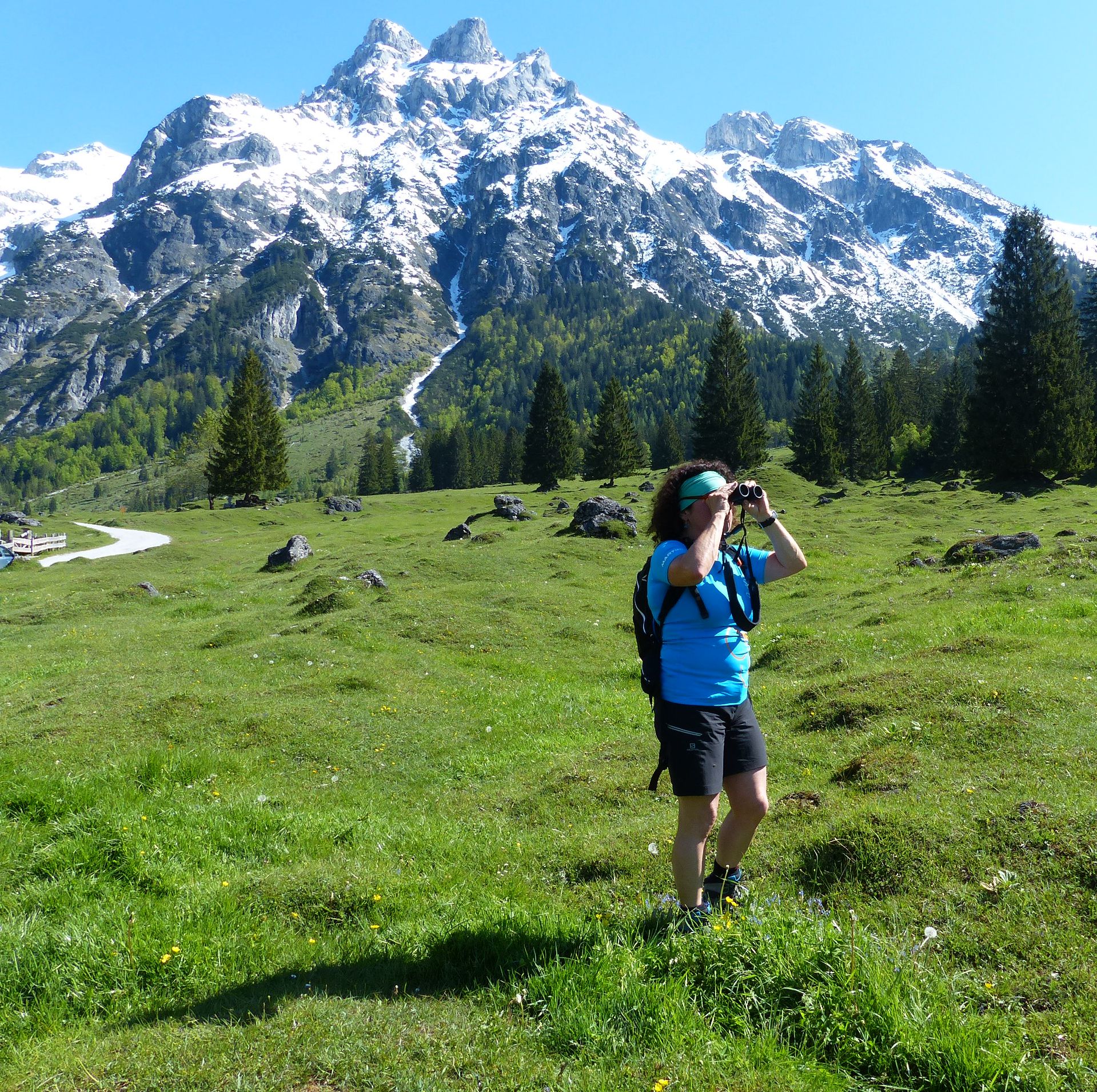 Das Gras und die Blumen auf der Alm stehen dichter und da ist es für die Wanderführerin an der Zeit, alle, die es mögen, aufzufordern, die Wanderstiefel auszuziehen und barfuss weiter zu laufen. Mit den Ferngläsern ist in den Bergen die Werfen-Hütte in etwa 2000 Meter Höhe zu sehen. Wir erfahren, dass sie über Hubschrauber versorgt wird und in dieser Saison ein Sherpa aus Nepal für die Saison engagiert wurde, ein Fachmann aus Nepals Bergen sozusagen.