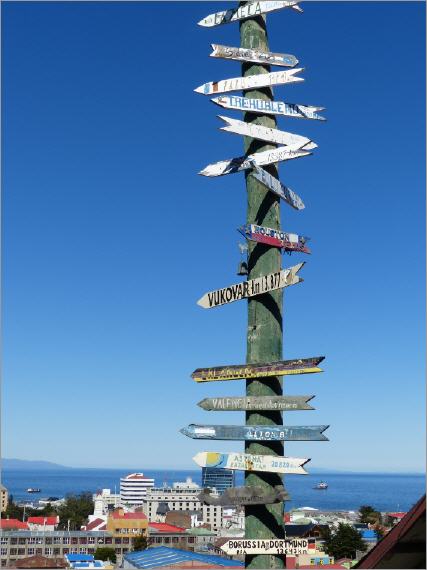 Hoch über der Stadt auf einem Aussichtspunkt ist einer der üblichen Masten mit dem Sammelsurium von Hinweisschildern aufgestellt. Darauf sind einige Kilometer-Entfernungen zu Städten in der Welt aufgelistet. Deutschland ist auch vertreten: 13.643 Kilometer Luftlinie Borussia Dortmund.