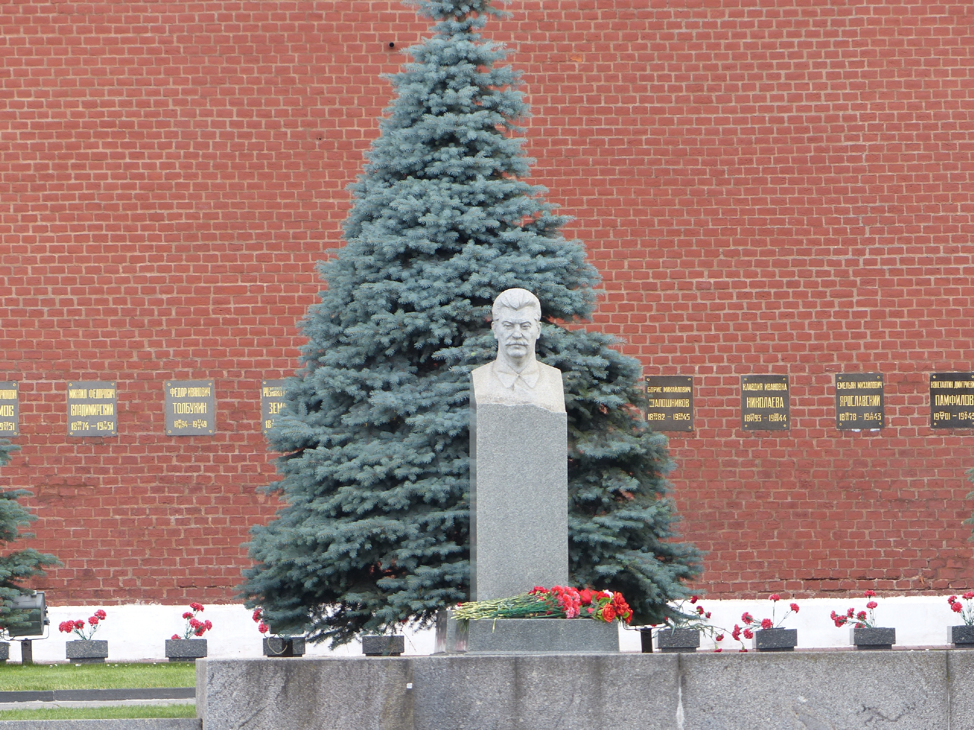 Doch die Schatten der Geschichte und der Gegenwart reichen auch auf den Roten Platz. Gleich links und rechts neben dem Mausoleum an der Kreml-Mauer befinden sich die Gräber mit den Kopf-Skulpturen von sowjetischen und russischen Staatslenkern. Unschwer zu erkennen ist darunter eine Stalin-Büste (i. B. links). Und an den großen Zugängen zum Platz drängen sich an aufgestellten Sicherheits-Sperren wie auf Flughäfen die Besucher, um ihr Gepäck und Taschen kontrollieren zu lassen. Der internationale Terrorismus bringt sich in Erinnerung.
