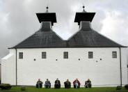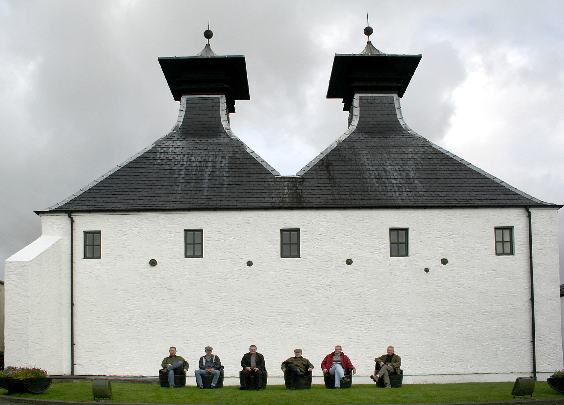 Bildunterschrift zu oben: Voller Vorfreude warten diese seriösen Herren, allesamt praktizierende Whisky-Liebhaber, unter den Pagodentürmen der Destillerie Ardbeg auf den Beginn der Vormittagsführung.